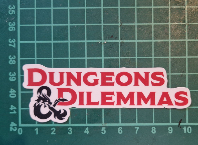 Vinyl sticker fashioned after the D&D logo saying "Dungeons and Dilemmas". Size in image, can withstand slight wetness.