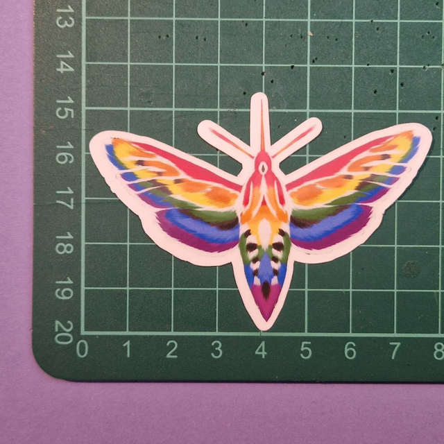 Vinyl sticker depicting a Hummingbird Hawk Moth in the Gay / LGBTQ+ Pride colour palette. Size in image, can withstand slight wetness.