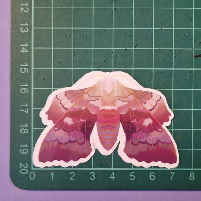Vinyl sticker depicting a Poplar Hawk Moth. Size in image, can withstand slight wetness.